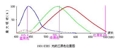 1931年國際照明委員會(CIE)規(guī)定紅、綠、藍(lán)三種原色光的波長分別為:700nm、546.1nm、435.8nm。為了理論闡述上的方便,我們把這三種原色光的位置標(biāo)記在“視網(wǎng)膜視錐細(xì)胞的光譜吸收曲線圖”上,(見下圖)。在這張