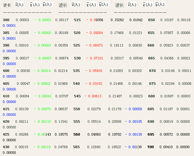通過這一段分析可以看出,從546.1nm到690nm這一段,b的數(shù)量是由0開始增加,之后又減少,到了690nm處的時(shí)候減少到0。顯然b在這區(qū)間內(nèi)肯定要有一個(gè)*大值。現(xiàn)在,我們來看一下“光譜三刺激值”表中的546.1nm到690nm這一段,其中起輔助作用的光的“藍(lán)原色”的數(shù)量的變化(即,藍(lán)色三刺激值的變化),不*是這樣的一種情形嗎?它有一個(gè)*大值*發(fā)生在545nm處,數(shù)值的大小是0.00138(在表中我們對這個(gè)*大值中的138標(biāo)了黑色,目的為了便于重新查找它。至于這個(gè)“刺激值”的負(fù)號來源,也*無需再作解釋了)。