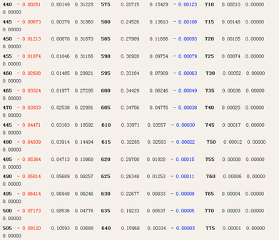 對于440nm到545nm這一段與380nm到435nm這一段中的光譜三刺激值的“負(fù)值”大小的來源*其道理上來說,應(yīng)該與上述情況是一樣的。在此不做繁瑣的推導(dǎo)。只給出結(jié)果。